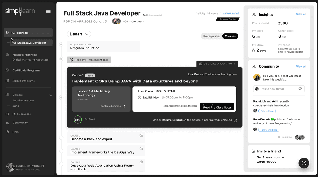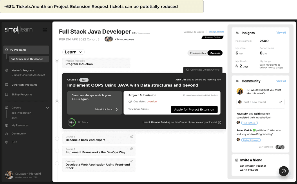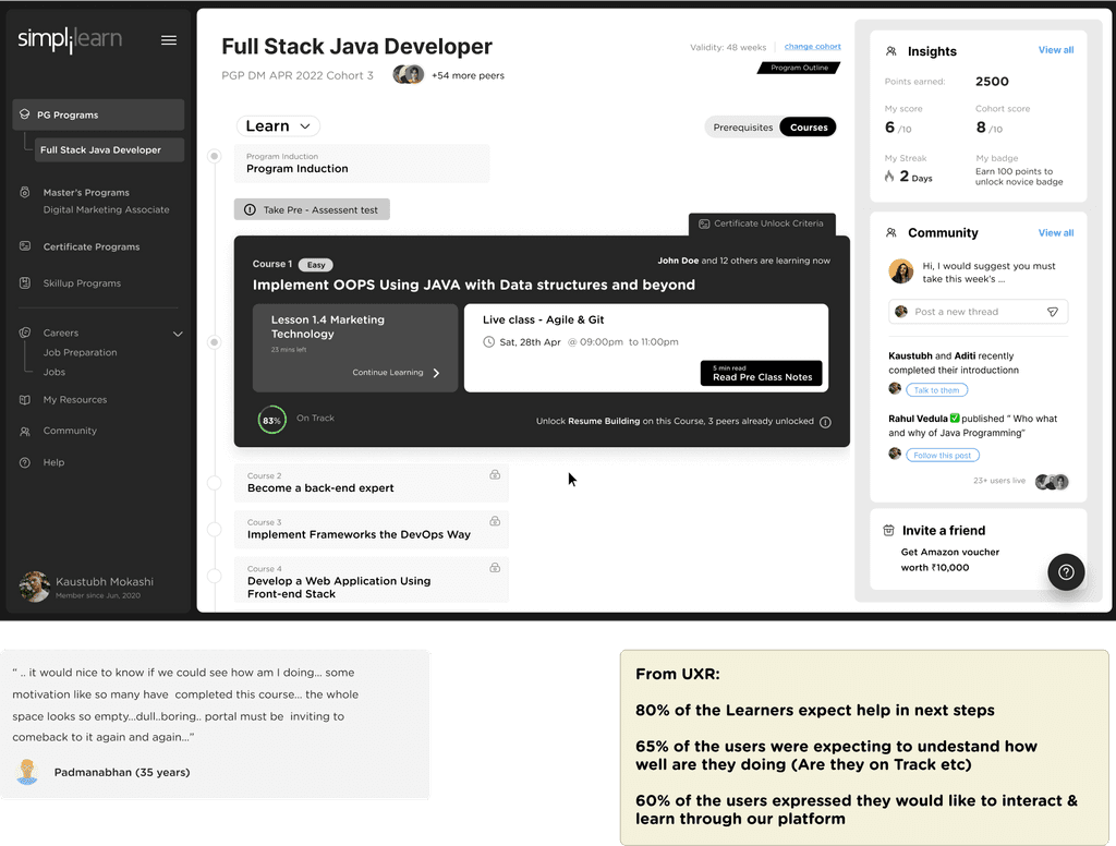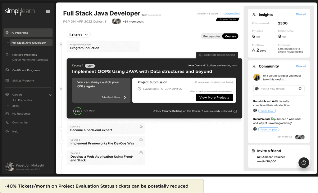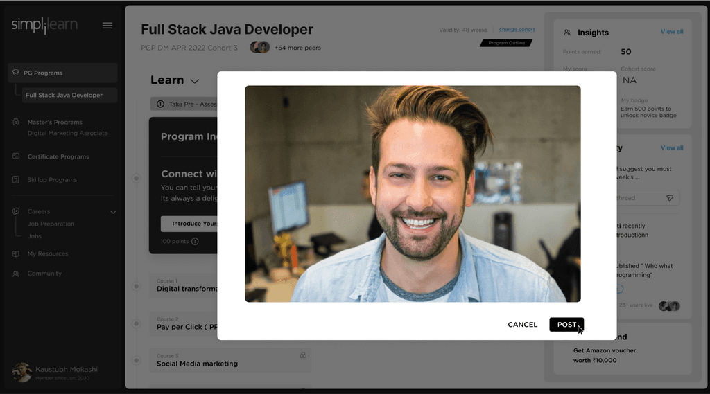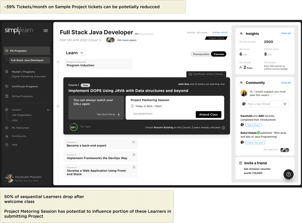 Middle card shows community interactions. Learners can directly respond on the ongoing threads and discussions on the community directly from the PDP. Learners will also be seeing posts / annoucements from simplilearn.