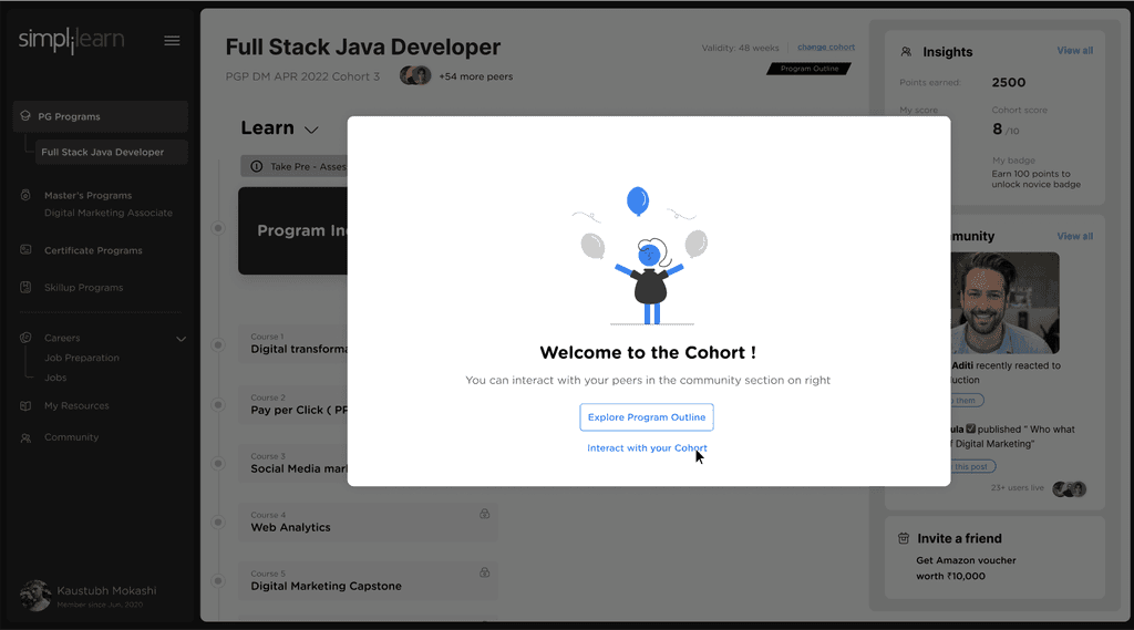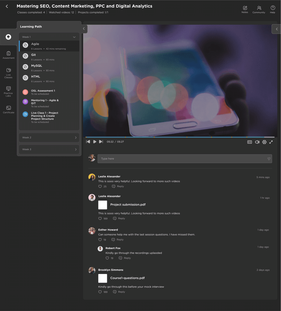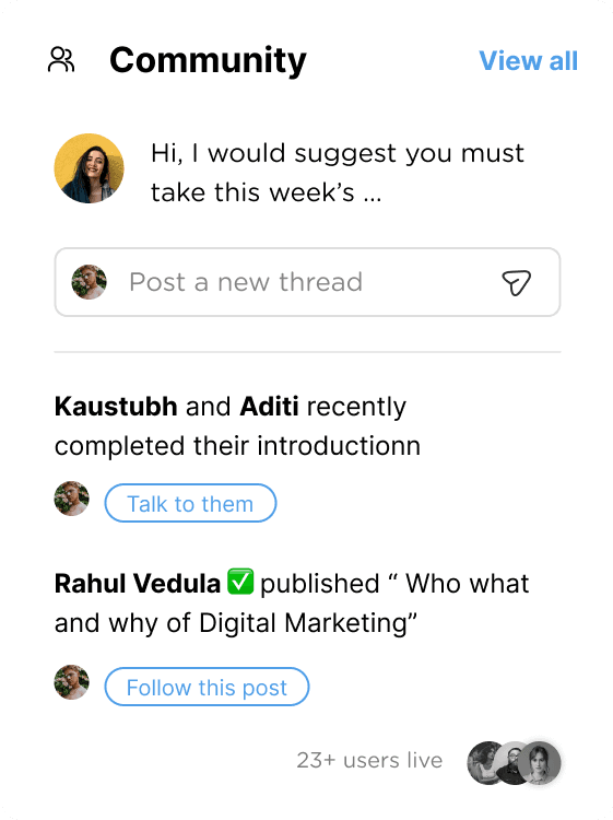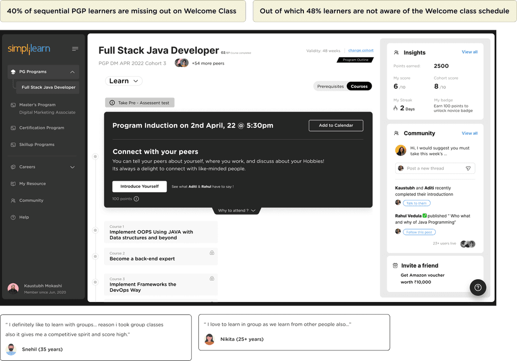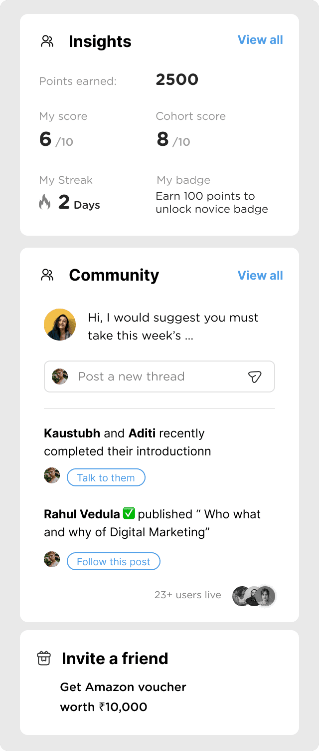 To create a sense of peer to peer collaboration, we give the Learners chance to interact with the peers at various touch points across their Learning Journey.