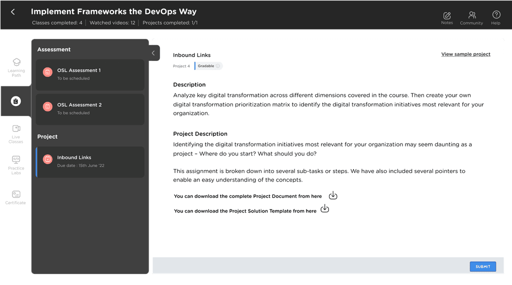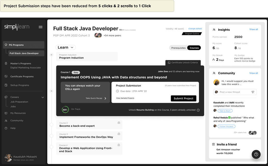 We have not only reduced the sequential number of steps for Project submission, but we have also brought the details of Project submission deadlines on our Course Card, which will always remind the Learners that there is a Project to Submit.