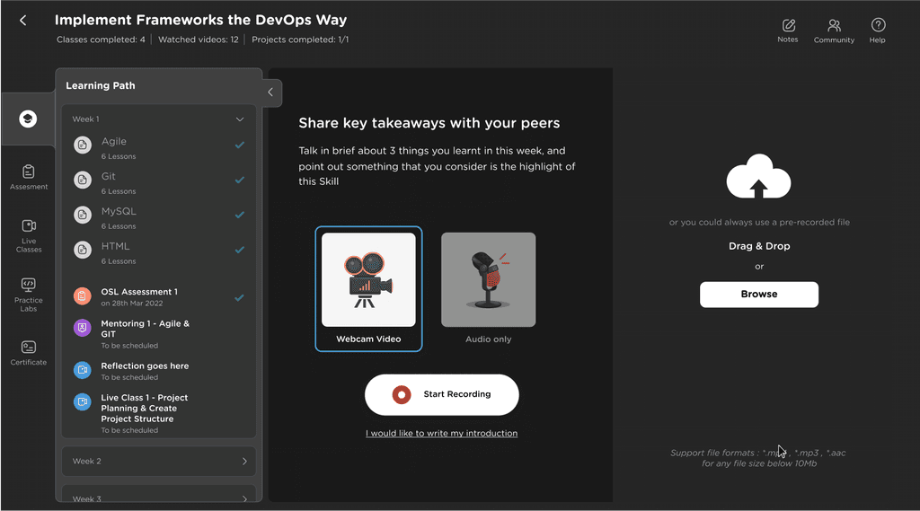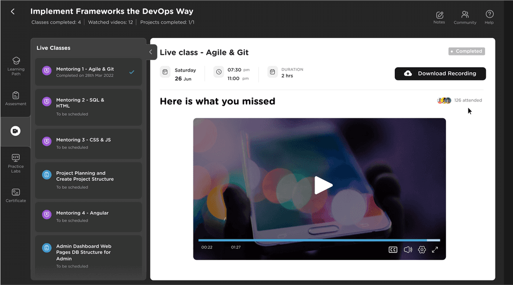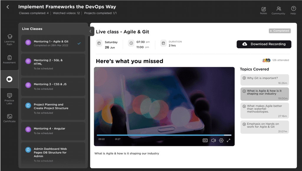 When a learner has completed the Live Class, along with the option to download recording, they will also have the option to play the recording in snippets, according to the topics marked. That improves their post class experience.