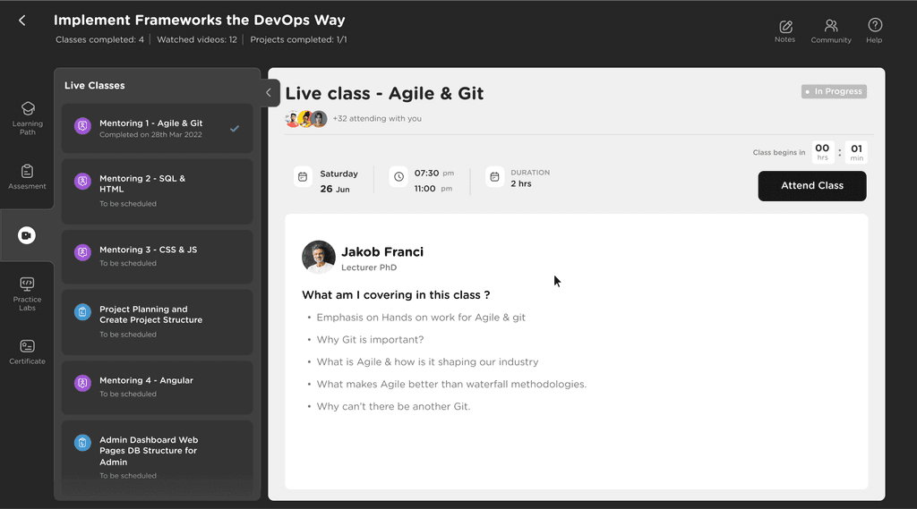Active course card showing the next upcoming live class