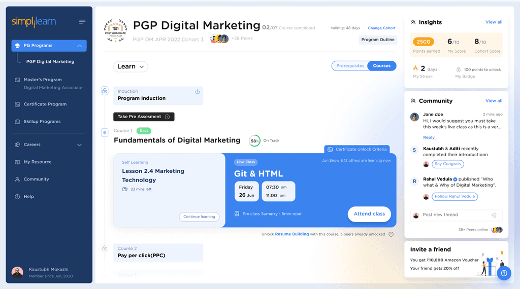 Top card shows Program Level insights. Things likes Learning Streak & Skill Badge can be a good motivating factor.